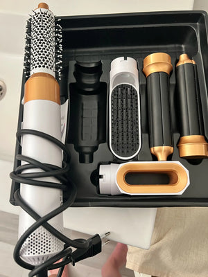 Pachetul conține o perie cu aer cald, un pieptene moale și un difuzor preformat.